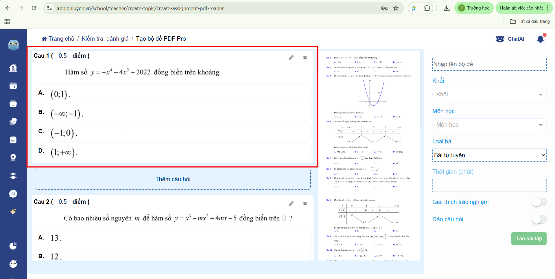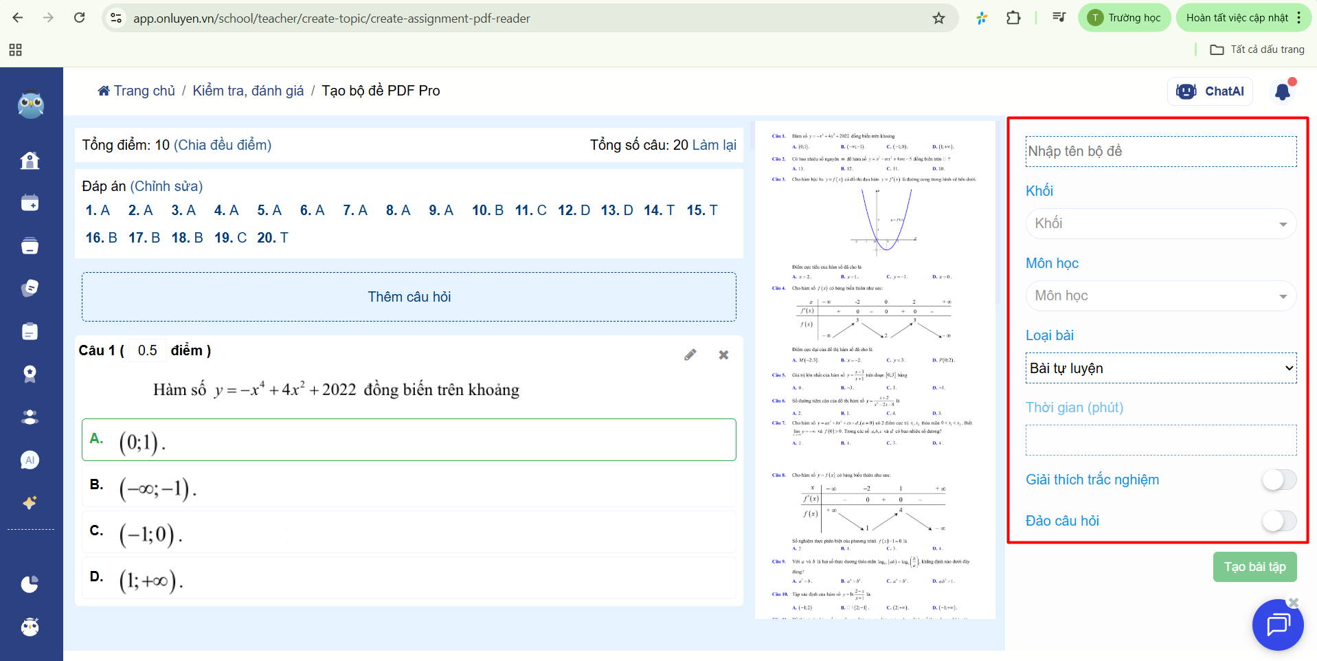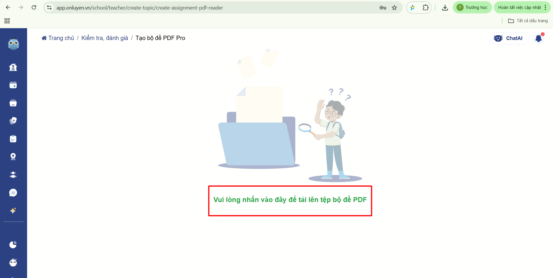 Tại đây, thầy/cô tải bộ đề của mình lên dưới dạng file PDF