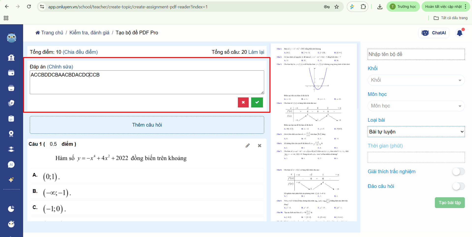 Sau khi điều chỉnh câu hỏi, Thầy/cô chọn “Chỉnh sửa”,nhập đáp án tương ứng cho các câu hỏi và cấu hình điểm cho các câu hỏi đó.