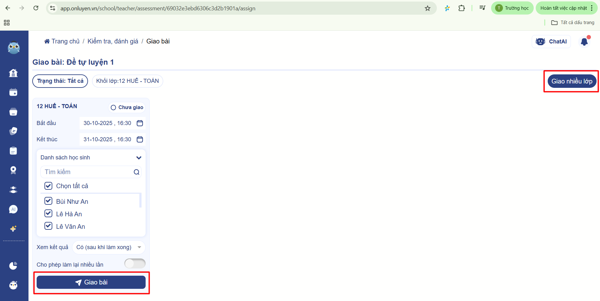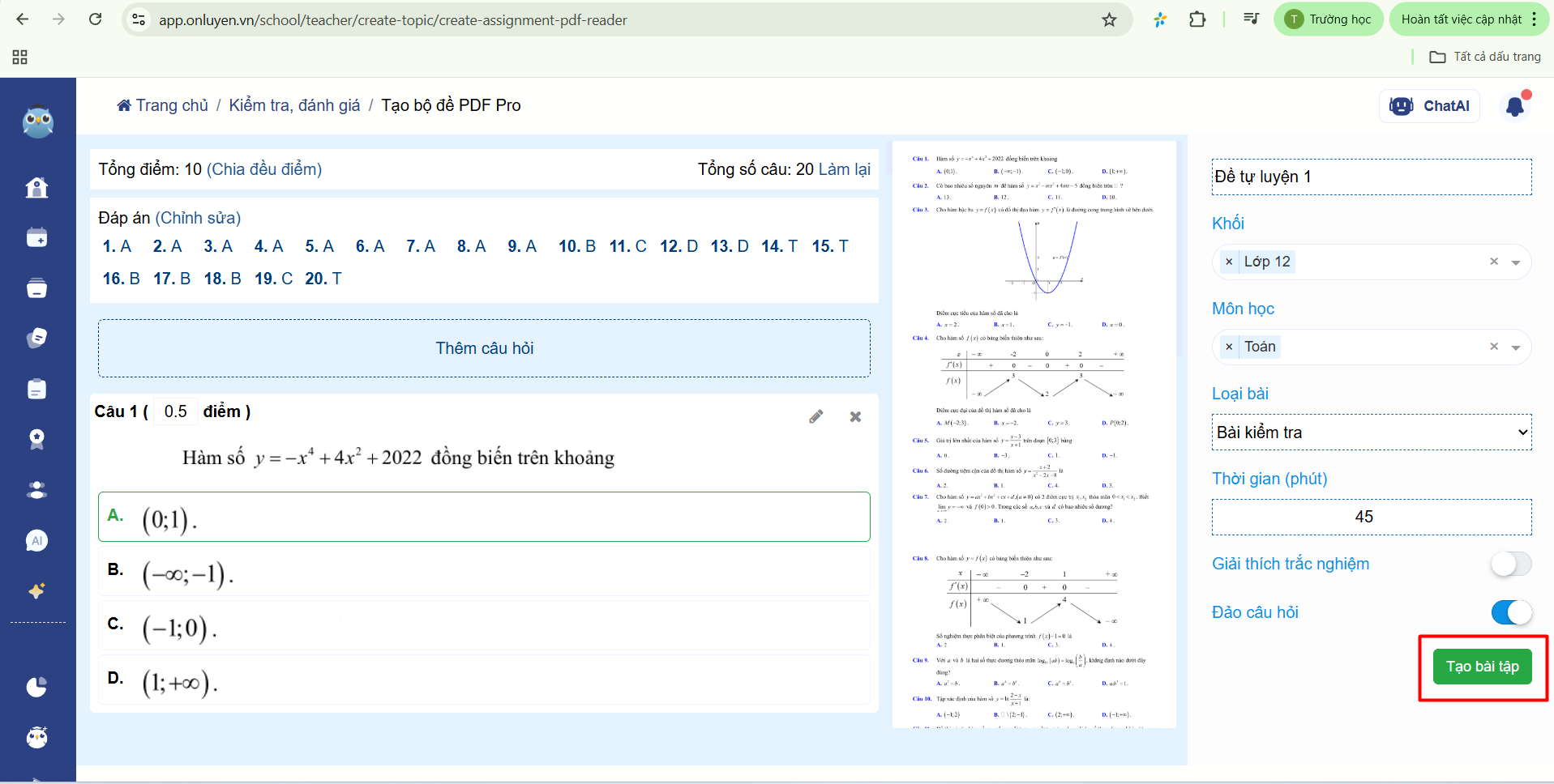 Sau khi hoàn thành cấu hình, Thầy/cô chọn “Tạo bài tập” và tiến hành giao cho học sinh