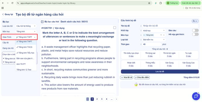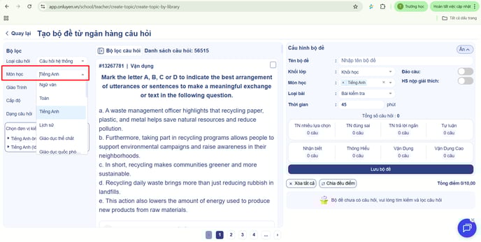 - Thầy/cô lọc môn học cần chọn môn cần lọc câu hỏi