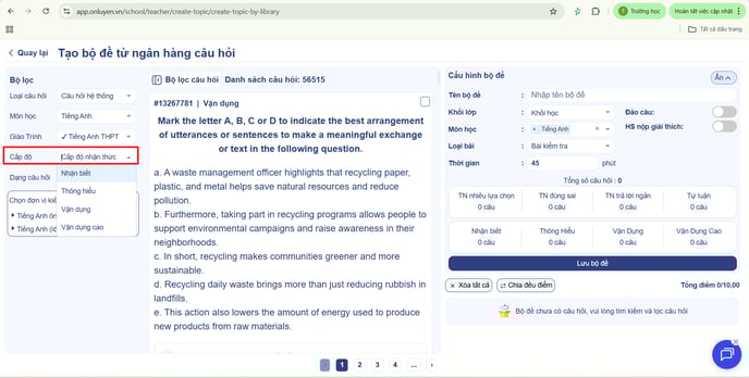 - Thầy/cô có thể chọn câu hỏi thuộc các cấp độ: Nhận biết, Thông hiểu, Vận dụng, Vận dụng cao