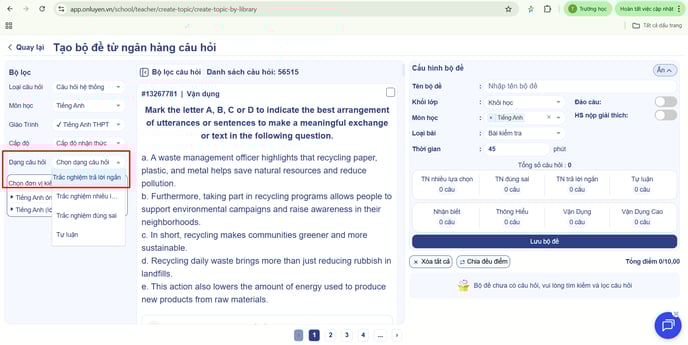Bước 4: Chọn câu hỏi từ ngân hàng câu hỏi