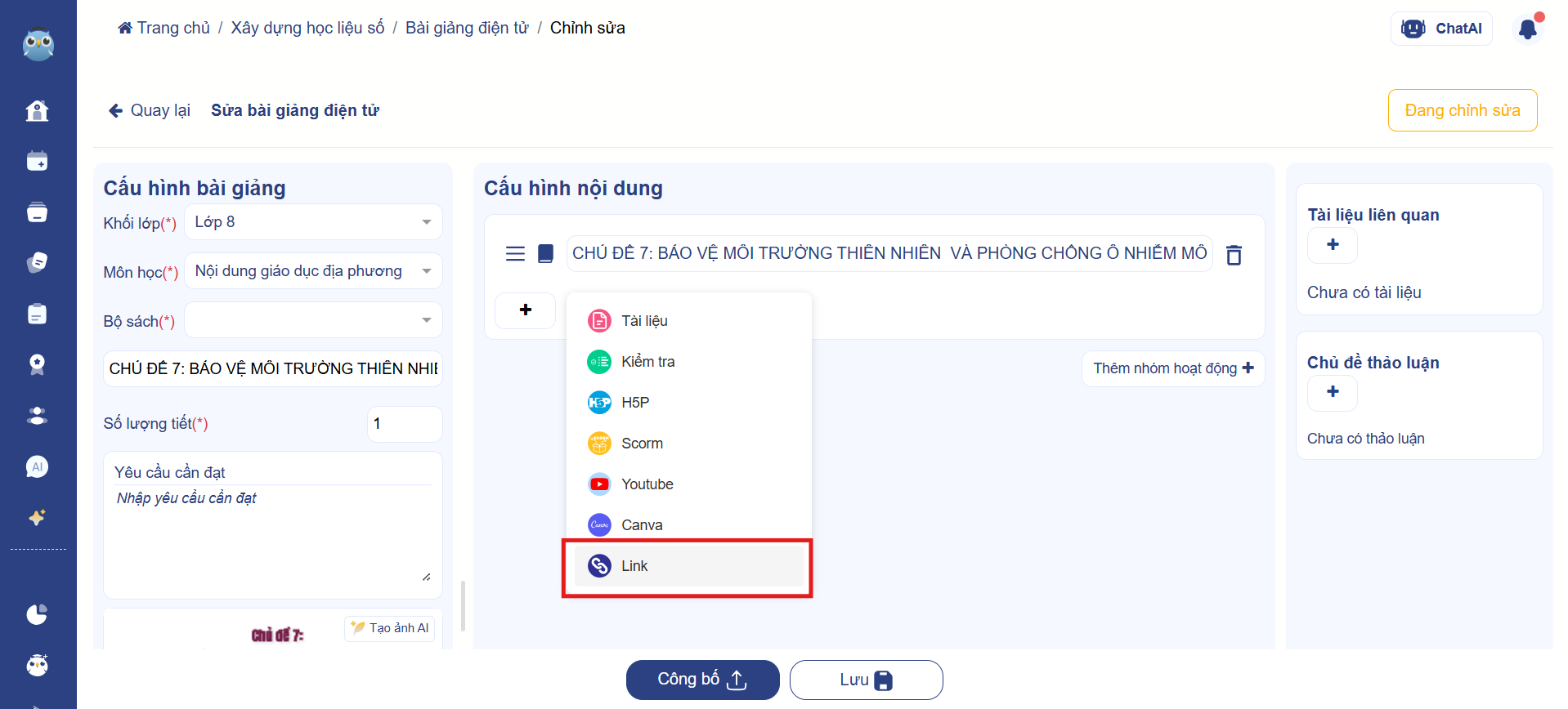 Bước 7: Thầy/cô nhập tên bài giảng, nhập điểm số bài và dán link đường dẫn