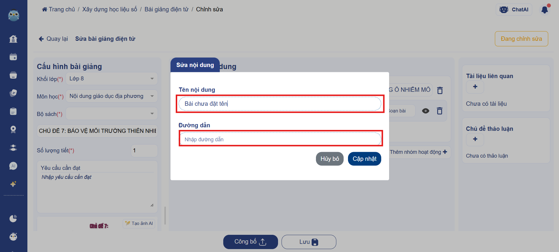 - Thầy/cô nhập tên nhóm hoạt động sau đó chọn “Thêm” để hệ thống cập nhật thành công tên bài tương ứng