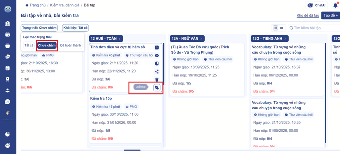- Thầy/cô chọn mục "Chưa chấm", hệ thống hiển thị các bộ đề đang chờ chấm điểm. Sau đó, chọn bài tập cần chấm điểm.