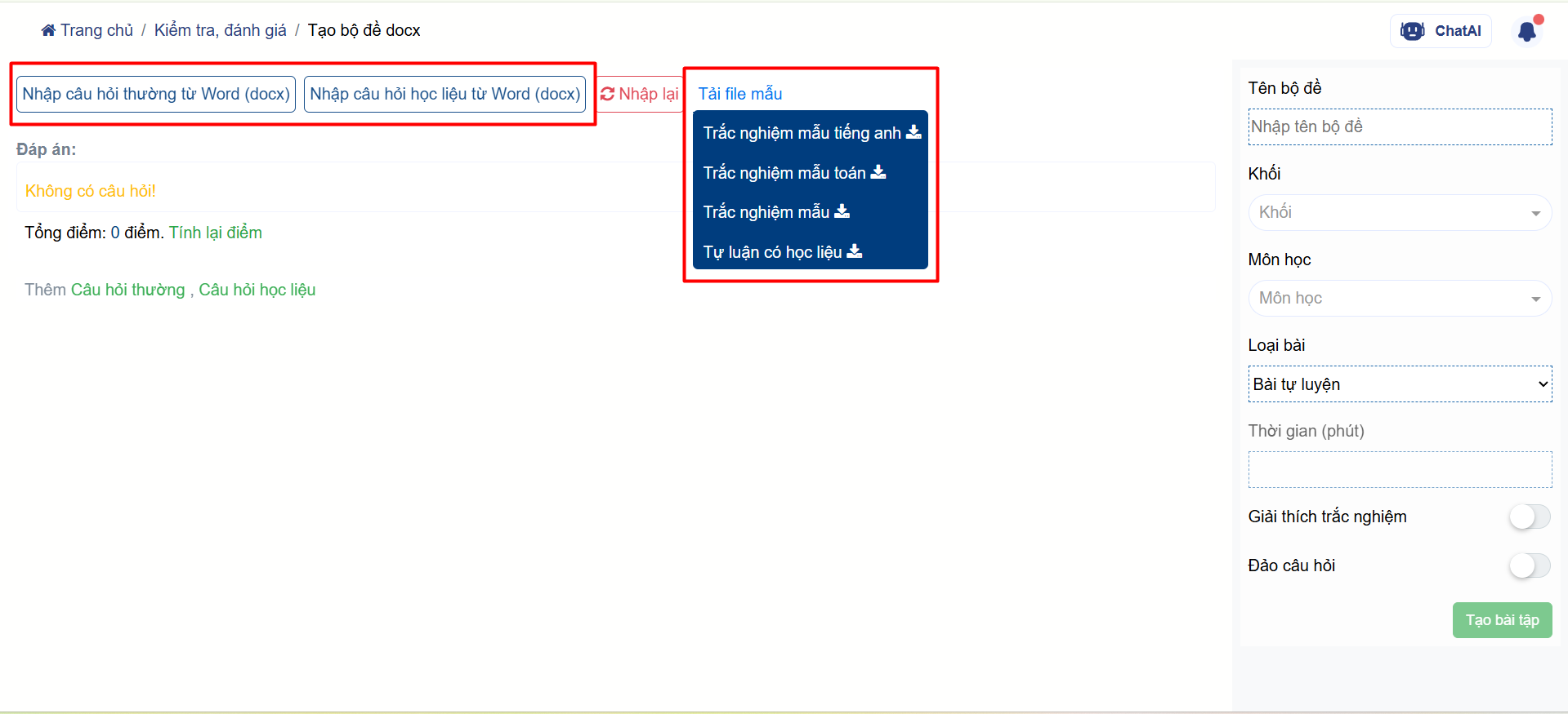 - Lưu ý: Thầy/cô có thể tải về file mẫu để xem cấu trúc và định dạng chuẩn. Sau đó, chỉnh sửa nội dung đề theo đúng định dạng trong file mẫu để hệ thống nhận diện chính xác khi tải lên.