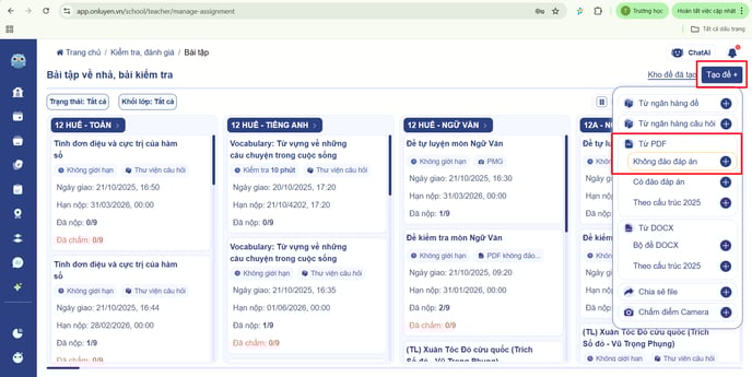 Bước 3: Thầy/cô chọn “Tạo đề”, chọn “Từ PDF không đảo đáp án”