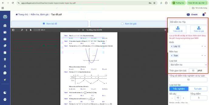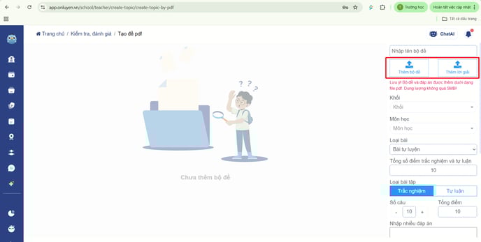 Thầy/cô chọn “Thêm bộ đề”, tải file đề PDF lên hệ thống.