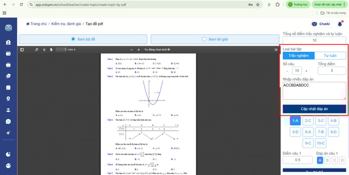- Đối với phần trắc nghiệm, tại khu vực nhập đáp án, thầy/cô nhập liên tiếp đáp án, không cách. Sau đó, chọn “Cập nhật đáp án” để lưu đáp án. Hệ thống sẽ tự động chia đều điểm cho các câu trắc nghiệm.