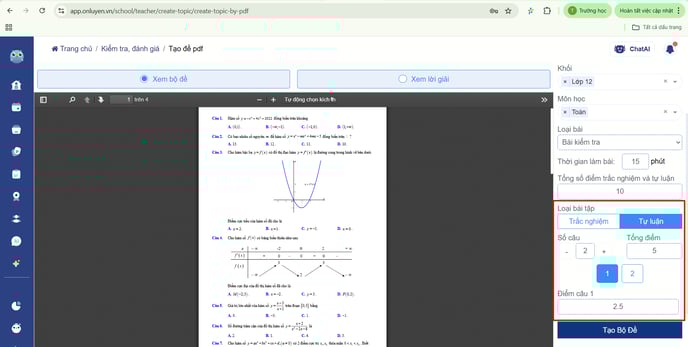 - Thầy/cô điều chỉnh tổng số câu hỏi trắc nghiệm, số câu hỏi tự luận, nhập tổng điểm cho mỗi phần (Đảm bảo tổng điểm cả bài là 10 điểm)