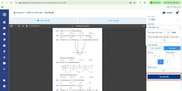 Sau khi hoàn thành cấu hình, thầy/cô chọn “ Tạo bộ đề” và tiến hành giao cho học sinh.