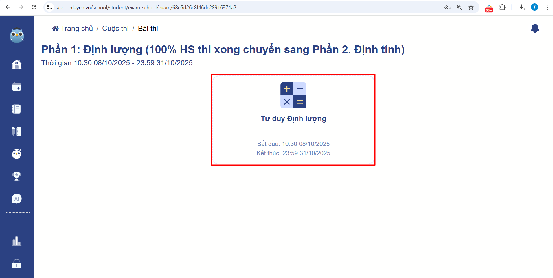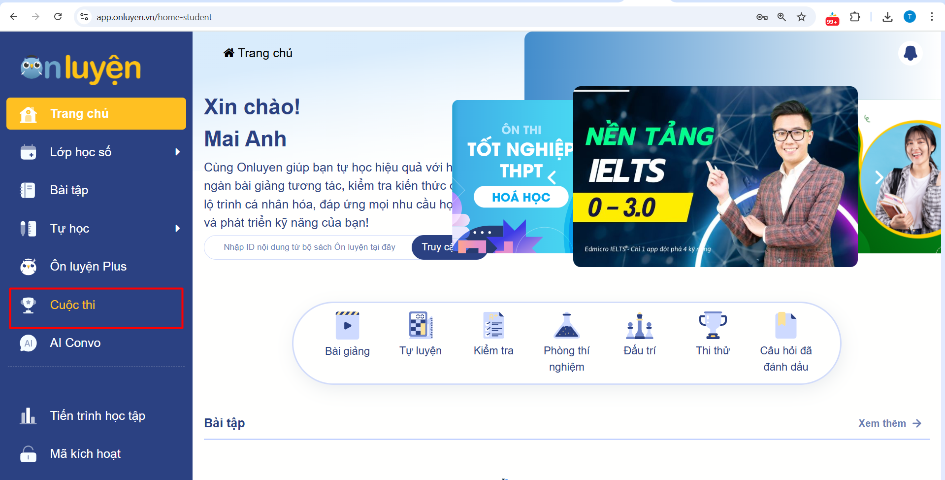 - Không hiển thị mục: “Cuộc thi”: Nguyên nhân là do học sinh đăng ký tài khoản tự do, không phải sử dụng tài khoản được Onluyen cung cấp cho nhà trường nên không có mục “Cuộc thi”. Cách khắc phục: em sử dụng tài khoản dự thi đúng bằng tài khoản được cấp: