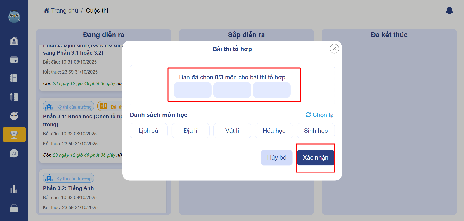Sau khi tích chọn 3 môn thì học sinh bấm "Xác nhận" để đến màn bài thi