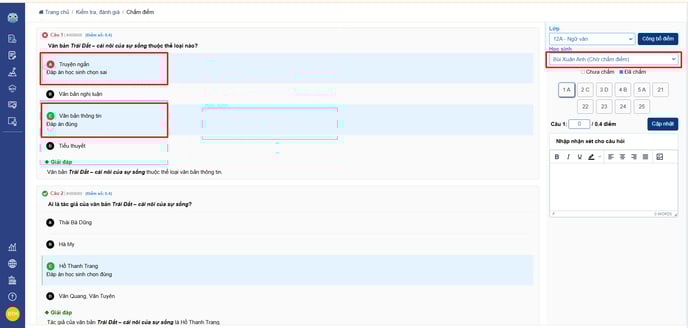 - Thầy/cô chọn lần lượt câu hỏi để chấm điểm, nhận xét và nhập điểm của từng câu trong bài của học sinh. Chọn cập nhật để lưu điểm cho từng câu.