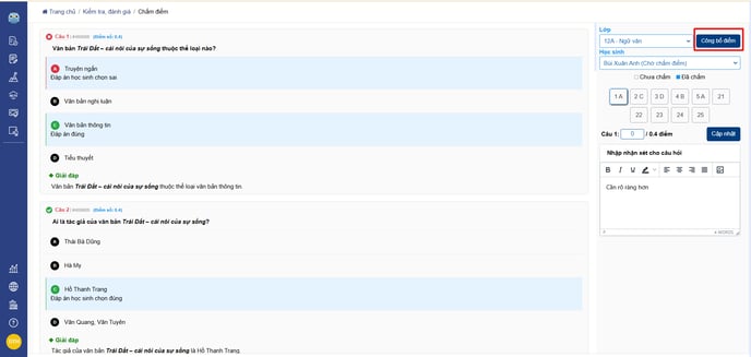 - Sau khi chấm bài cho tất cả các học sinh trong lớp, chọn "Công bố điểm" để công bố điểm cho các học sinh.