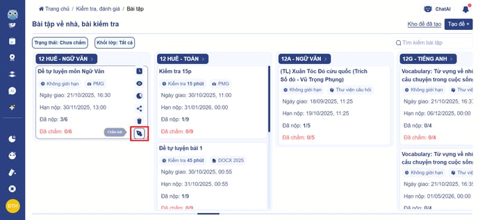Bước 4: Thầy/cô chọn bài cần chấm điểm, chọn biểu tượng "chấm bài" để tiến hành chấm bài cho học sinh
