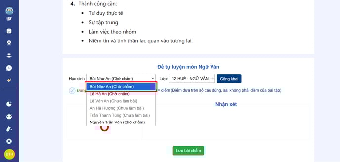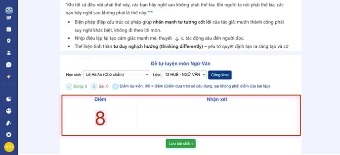Bước 7: Sau khi đã chấm điểm trên file ảnh học sinh gửi, Thầy/cô kéo xuống nhập điểm và nhận xét. Sau đó, Thầy/cô chọn “Lưu bài chấm”.