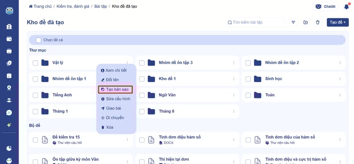 - Tại tên bài tập cần tạo bản sao, thầy/cô tích chọn biểu tượng dấu 3 chấm.