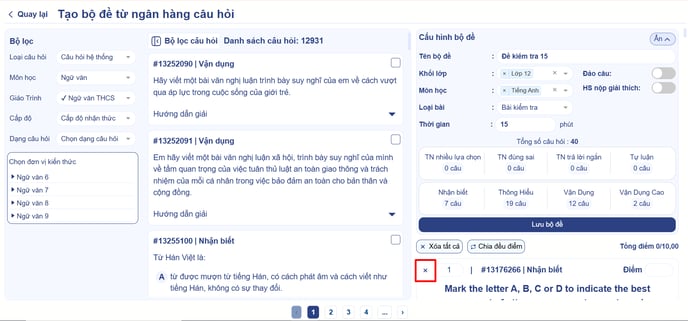 - Thầy/cô có thể xem lại nội dung câu hỏi trong bộ đề và xóa đi các câu hỏi không phù hợp bằng cách tích chọn vào biểu tượng dấu “X” ngay trước mỗi câu hỏi.