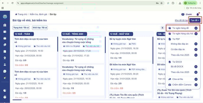 Bước 3: Thầy/cô chọn “Tạo đề”, sau đó chọn "Từ ngân hàng đề"