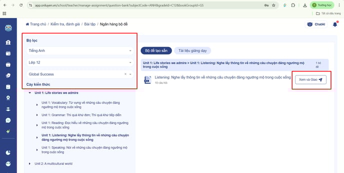 - Thầy/cô có thể tìm kiếm các thông tin: Môn học, khối lớp, bộ sách áp dụng. Hệ thống sẽ hiển thị các bộ đề có sẵn, Thầy/cô chọn bộ đề muốn sao chép, chọn "Xem và Giao" để giao đề cho học sinh.