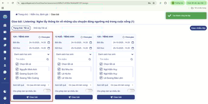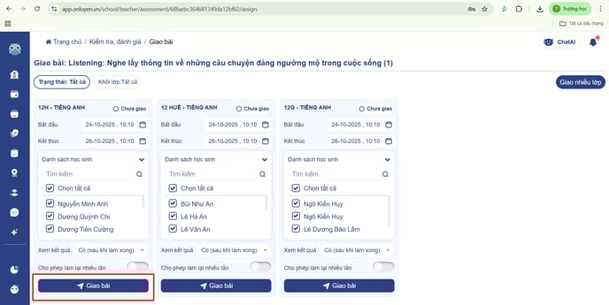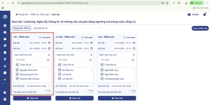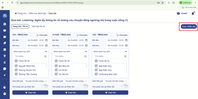 - Thầy/cô có thể nhấn vào nút ‘Giao nhiều lớp’ để giao cho các lớp thầy cô giảng dạy