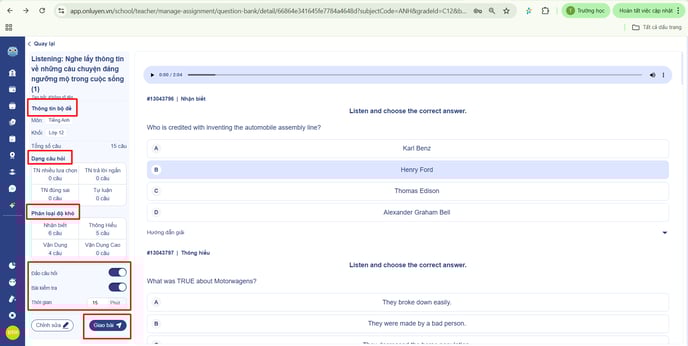 - Thầy/cô có thể bật tùy chọn Đảo câu hỏi và chọn loại bài tự luyện hoặc kiểm tra.