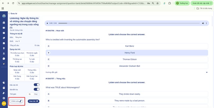 Bước 7: Ngoài ra, thầy/cô có thể chọn "Chỉnh sửa" để thêm các câu hỏi vào bộ đề có sẵn
