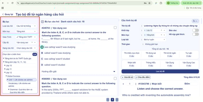 - Thầy/cô có thể chọn thêm câu hỏi từ Ngân hàng câu hỏi bằng cách lọc các câu hỏi kiến thức theo môn học, đơn vị kiến thức, dạng bài, mức độ câu hỏi tại mục "Lọc"