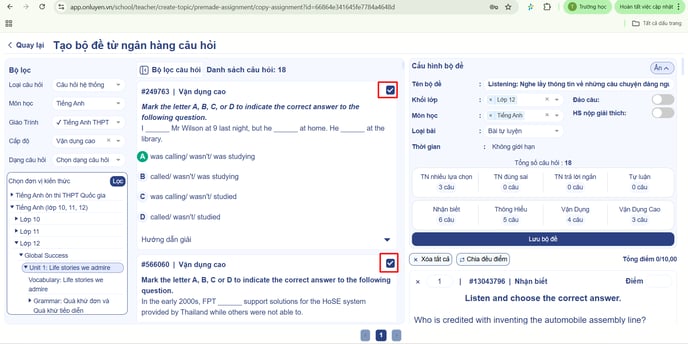 - Thầy/cô tích vào ô vuông để chọn câu hỏi phù hợp với bộ đề đang tạo.