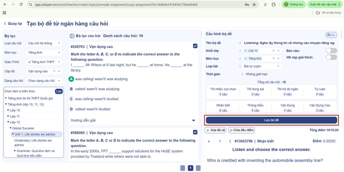 - Sau khi hoàn thành cấu hình, Thầy/cô chọn “Lưu bộ đề” và tiến hành giao cho học sinh