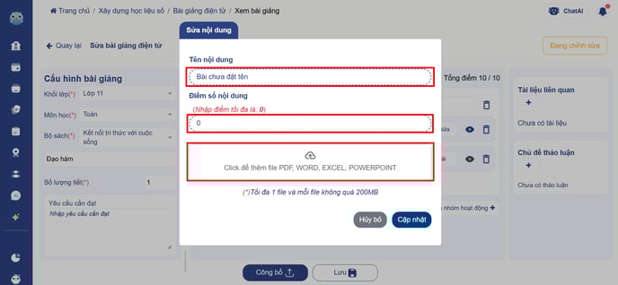 Bước 6: Thầy/cô điền đầy đủ thông tin bài giảng điện tử và chọn biểu tượng "Đám mây" để đưa file từ thiết bị cá nhân lên hệ thống.