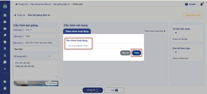 Bước 2: Thầy/cô điền tên nhóm hoạt động và nhấn "Thêm".