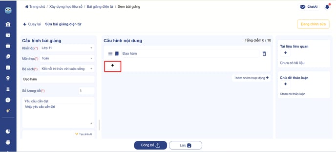 - Thầy/cô chọn biểu tượng dấu "+" để thêm nội dung bài giảng.