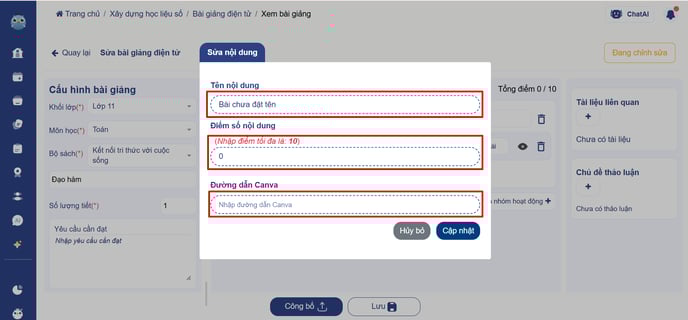 - Thầy/cô điền đầy đủ thông tin tên nội dung, điểm số và dán đường dẫn canva.