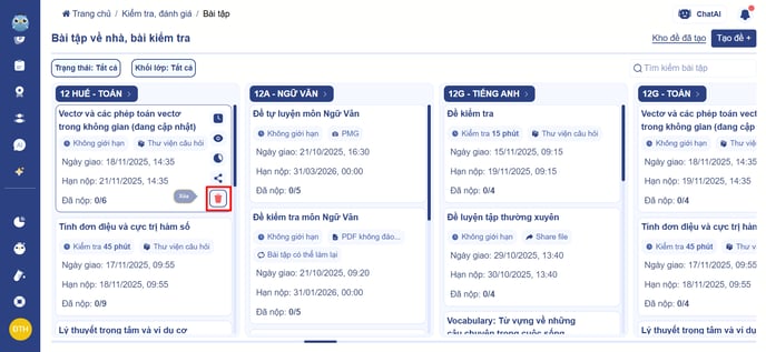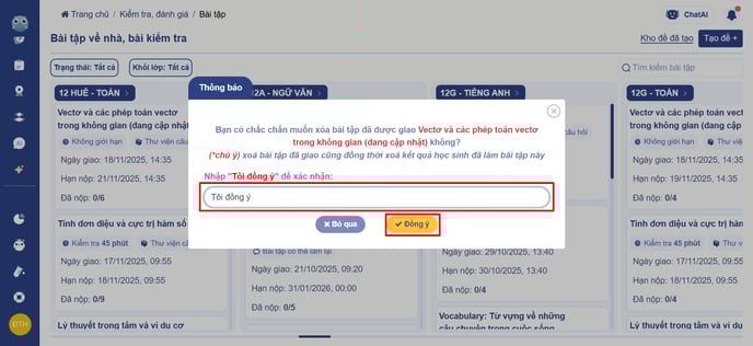 * Lưu ý: Xóa bài tập đồng nghĩa với việc xóa toàn bộ kết quả học sinh đã nộp, vì vậy Thầy/cô cần cân nhắc kỹ trước khi thao tác.