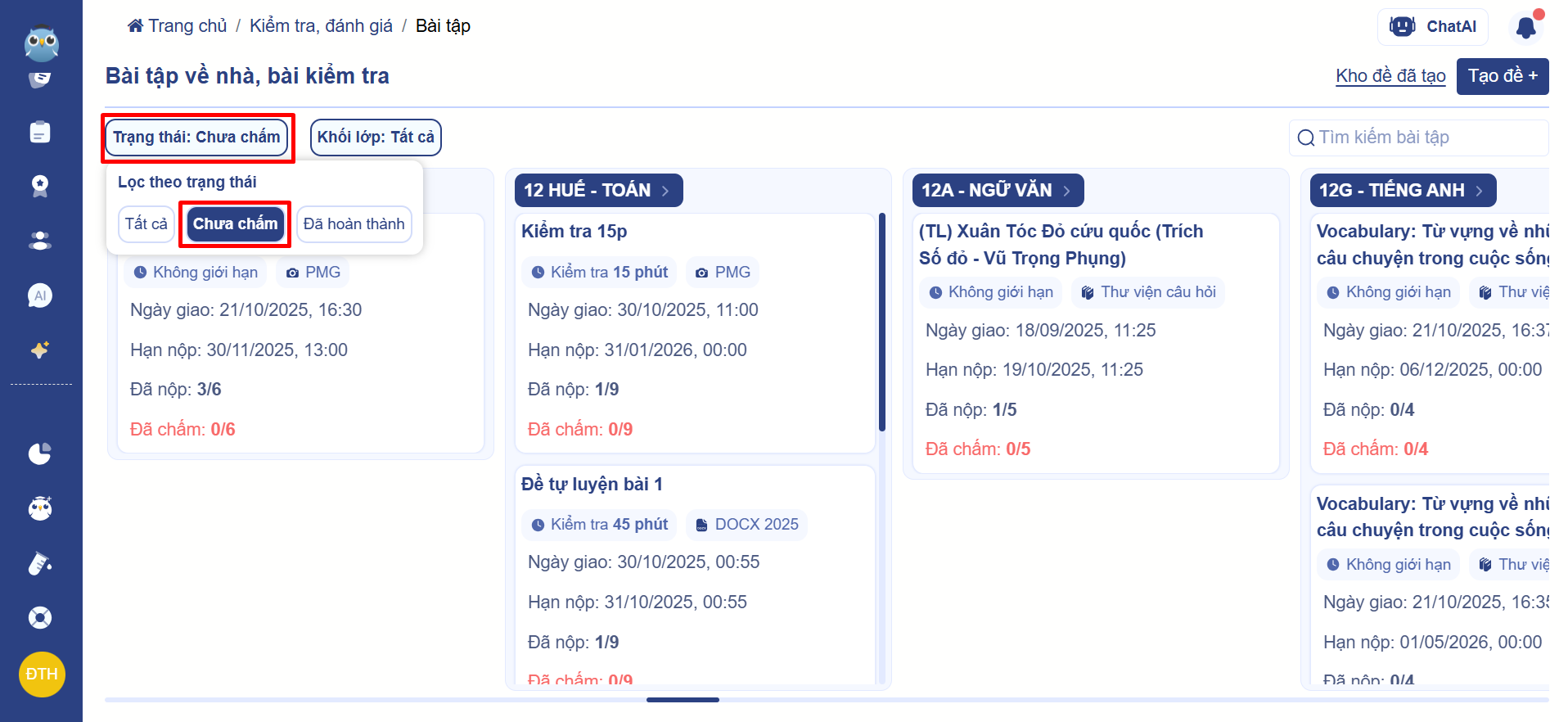 Bước 3: Tại mục Trạng thái, thầy/cô lọc theo trạng thái “Chưa chấm”