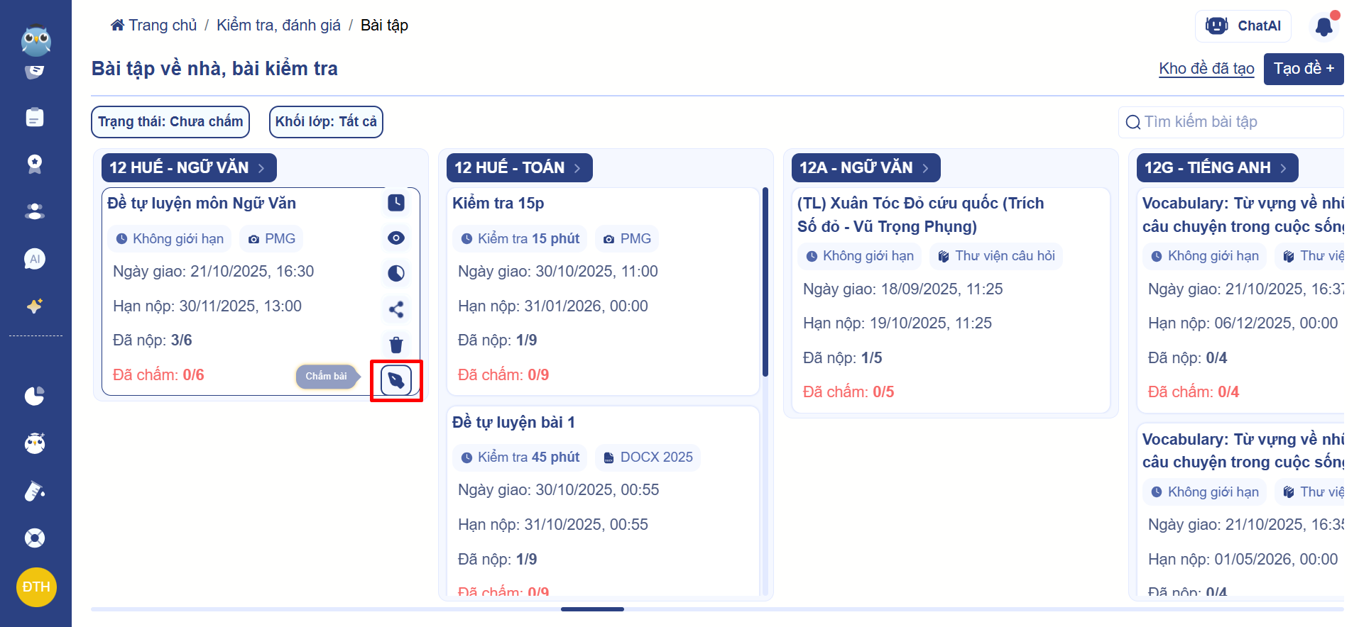 Bước 4: Thầy/cô chọn bài cần chấm điểm, chọn biểu tượng "chấm bài" để tiến hành chấm bài cho học sinh
