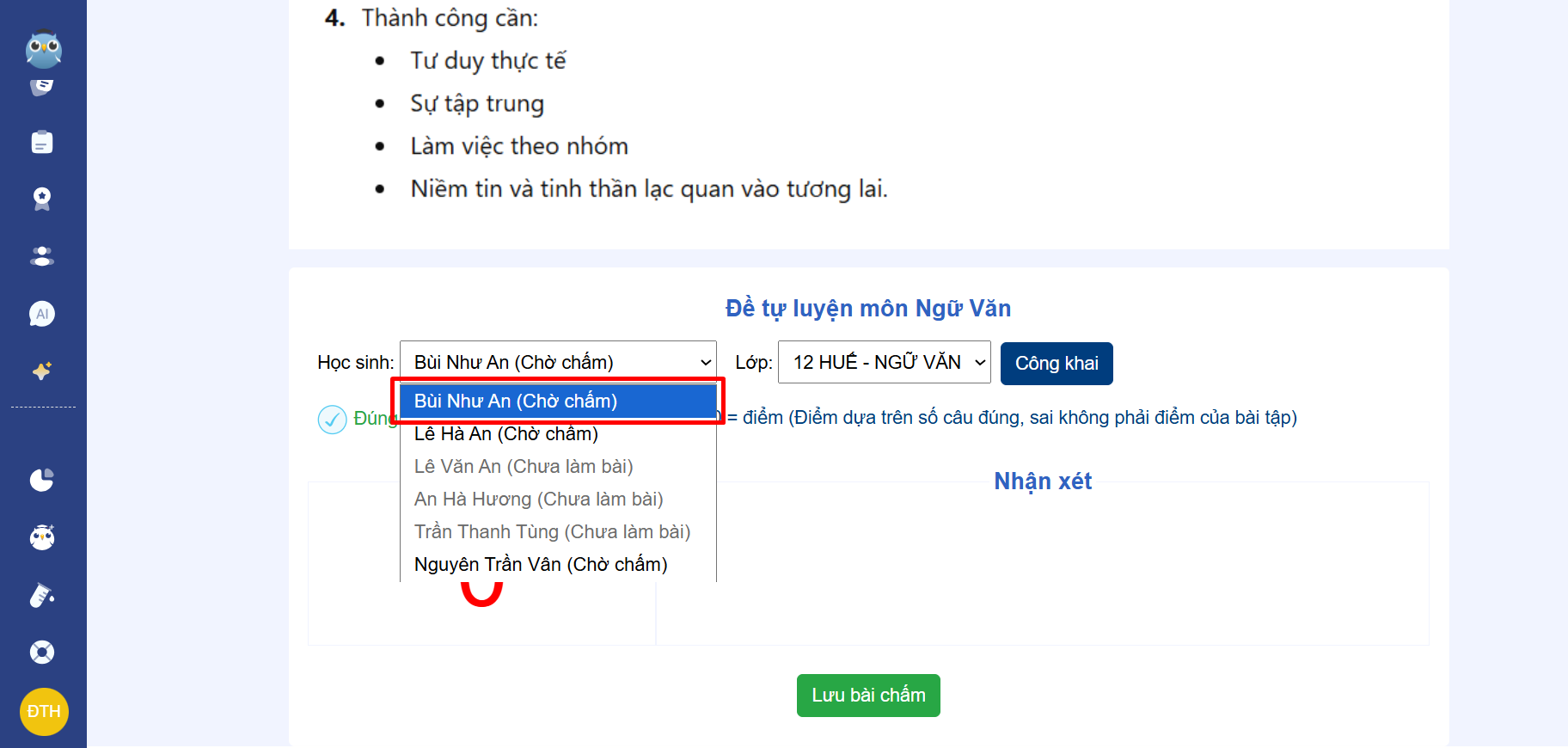 Bước 5: Tại màn chấm bài, thầy/cô kéo xuống dưới để lọc trạng thái học sinh chờ chấm điểm để chấm bài cho học sinh