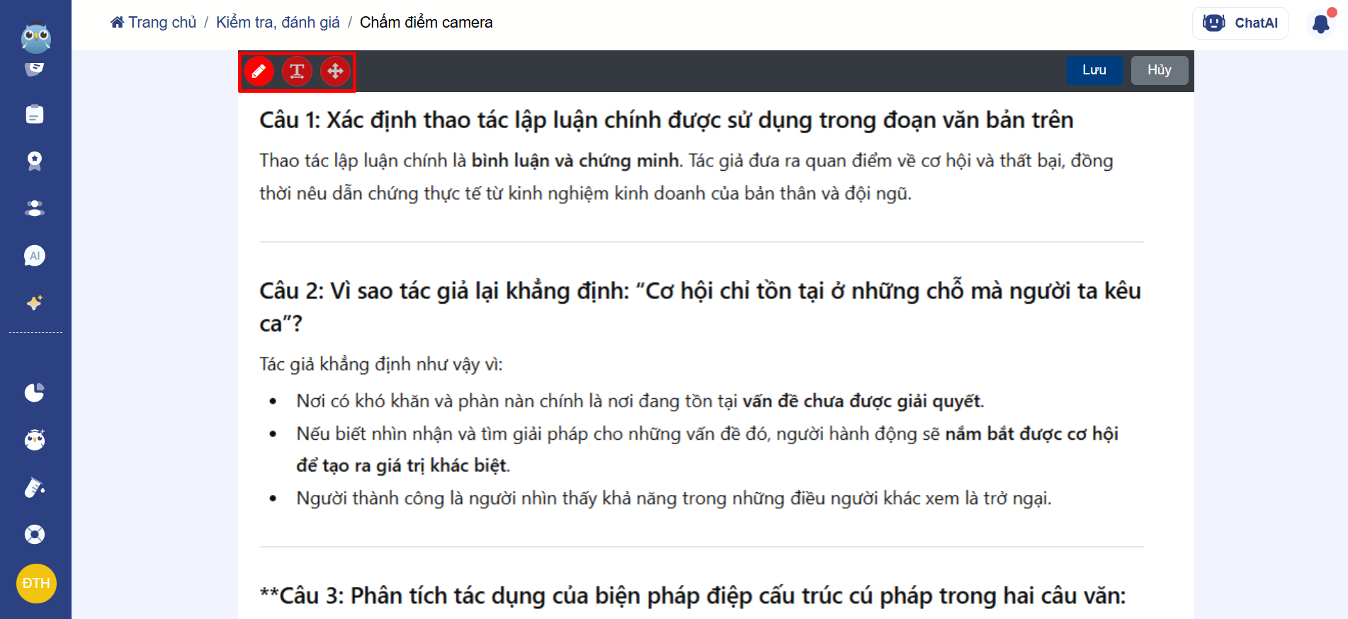 Hệ thống sẽ hiển thị bài làm của học sinh ở phía trên. Thầy/cô chọn biểu tượng chiếc bút để chấm bài trực tiếp trên file ảnh đáp án học sinh đã gửi