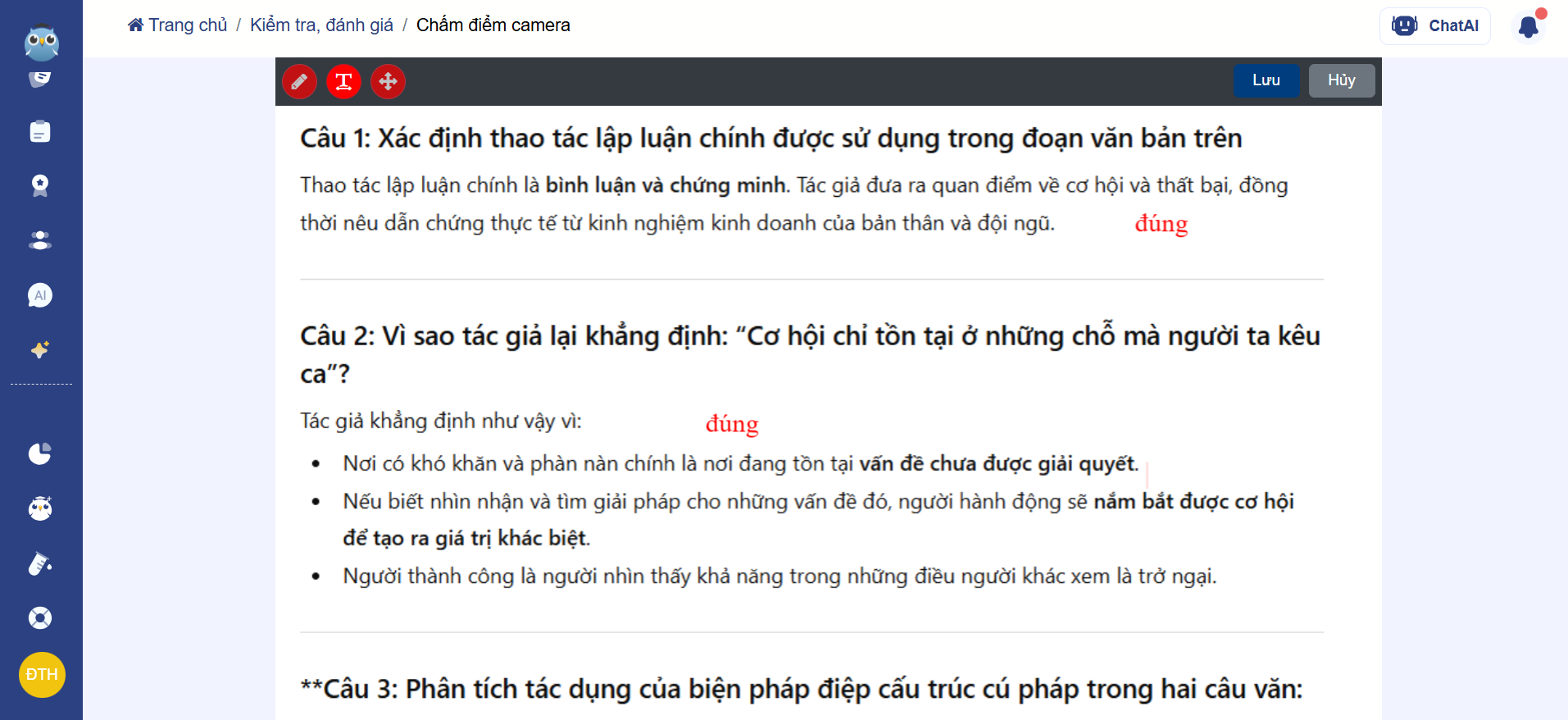 Tại thanh công cụ: Thầy/cô chọn biểu tượng tương ứng để thao tác chấm bài cho học sinh