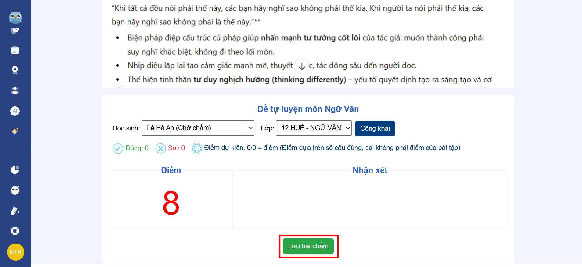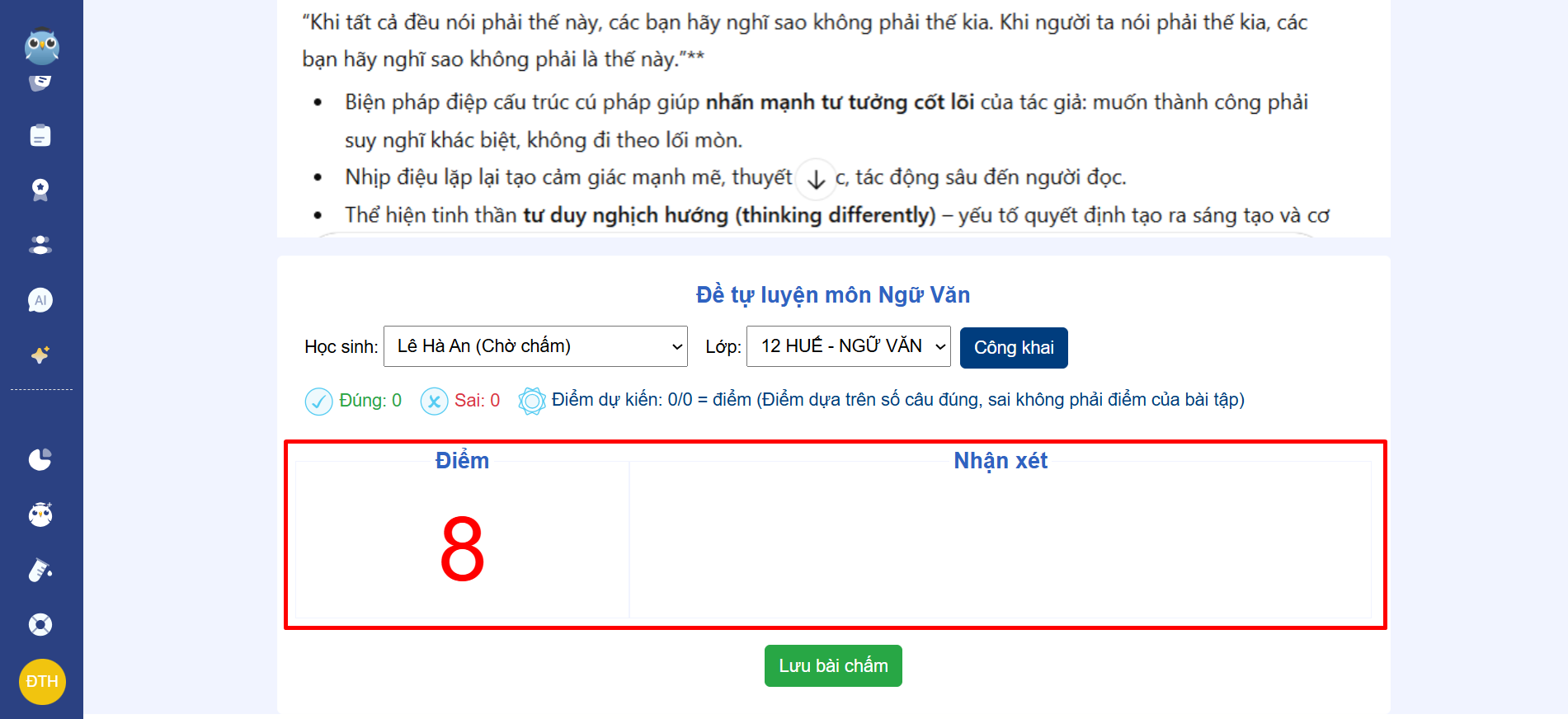 Bước 7: Sau khi đã chấm điểm trên file ảnh học sinh gửi, Thầy/cô kéo xuống nhập điểm và nhận xét. Sau đó, Thầy/cô chọn “Lưu bài chấm”.