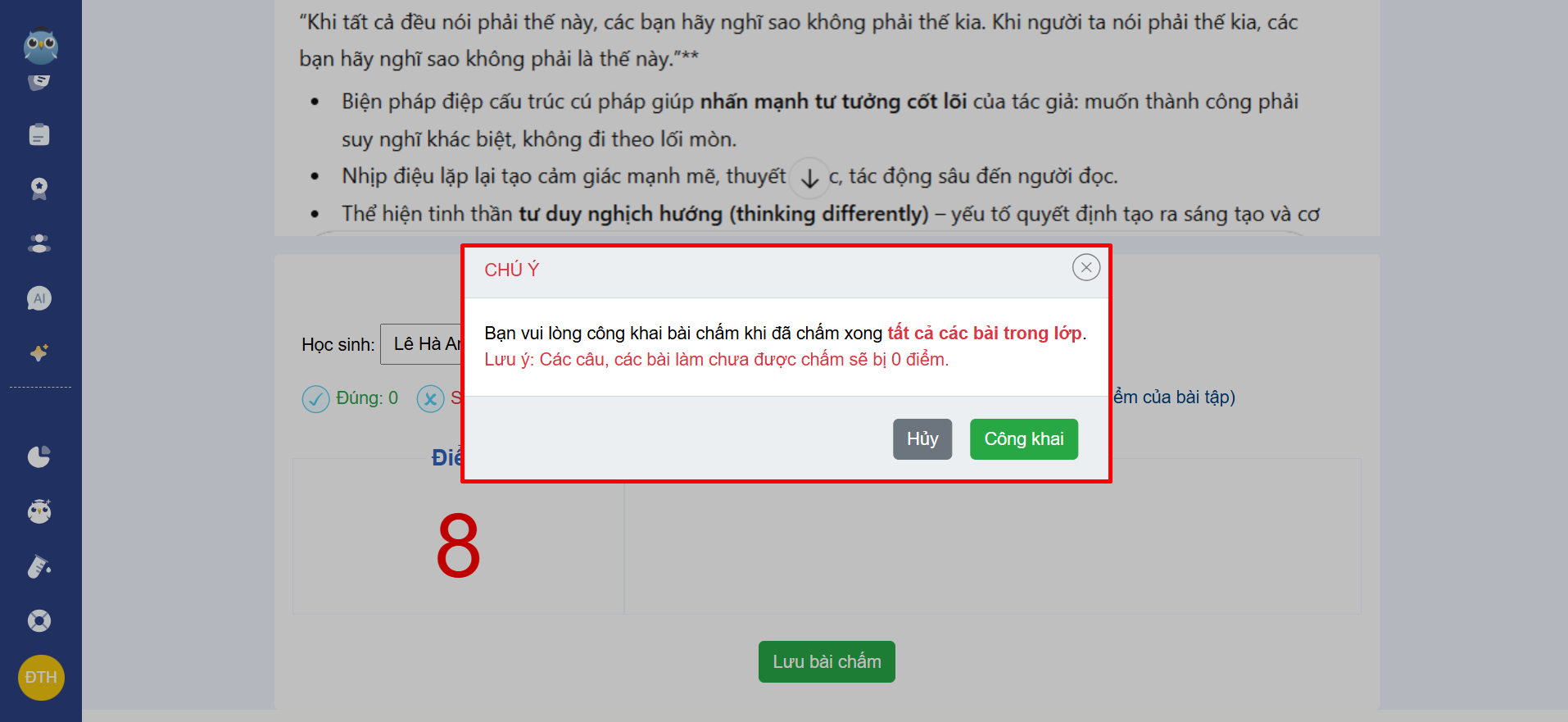 * Thầy/cô lưu ý: nếu Thầy/cô chọn Công khai điểm cho cả lớp, các bài còn lại chưa chấm sẽ bị 0 điểm.