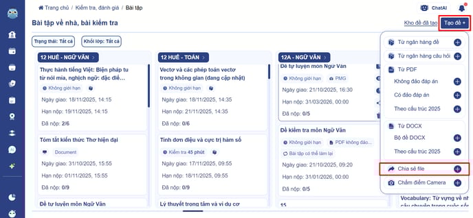 Bước 3: Thầy/cô chọn “Tạo đề”, sau đó chọn "Chia sẻ file"