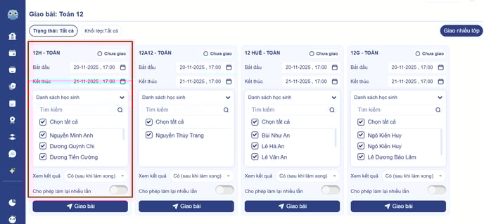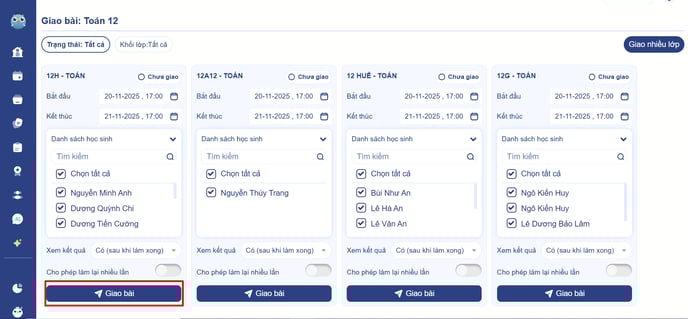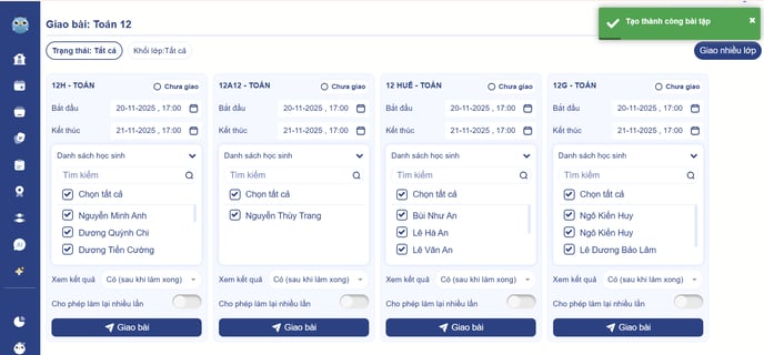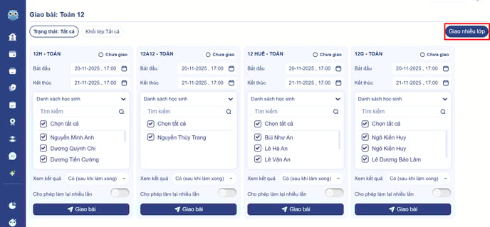 - Thầy/cô có thể nhấn vào nút ‘Giao nhiều lớp’ để giao cho các lớp thầy cô giảng dạy