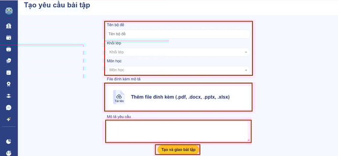 Thầy/cô điền tên bộ đề, chọn khối lớp, môn học được giao. Thầy/cô tải lên file cần giao cho học sinh, nhập mô tả sau đó chọn "Tạo và giao bài tập"
