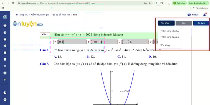 Thầy/cô chọn “Tùy chỉnh” để thêm hoặc chỉnh sửa vùng câu hỏi và vùng đáp án tương ứng của mỗi câu. Sau đó chọn “Áp dụng” để lưu thay đổi