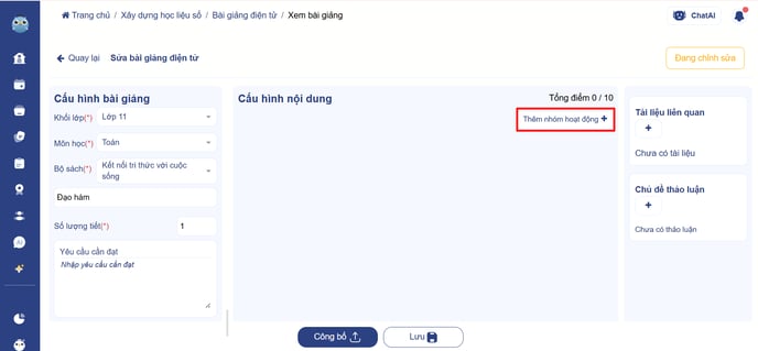 - Tại màn cấu hình nội dung, thầy cô chọn “Thêm nhóm hoạt động”