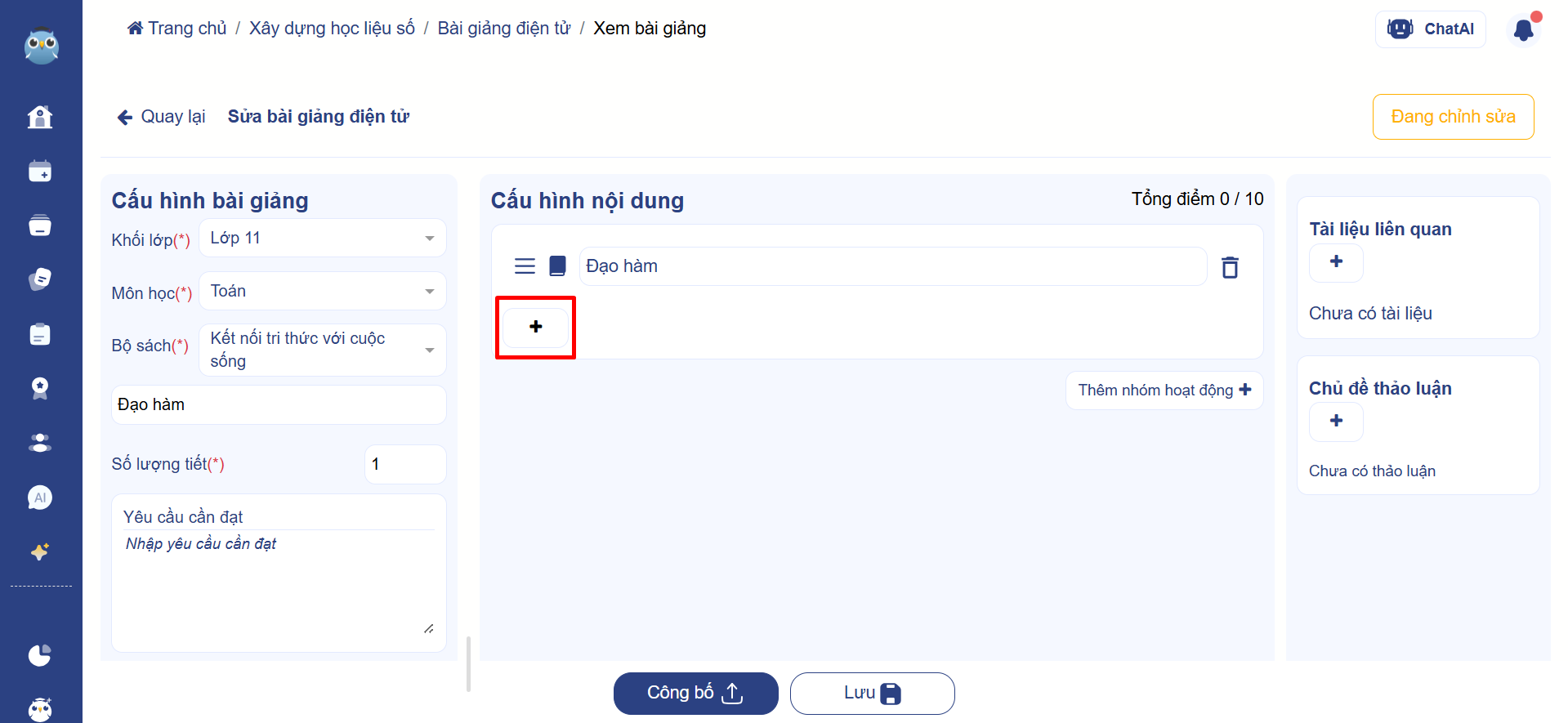 Bước 4: Thầy/cô chọn biểu tượng dấu "+" để thêm nội dung bài giảng