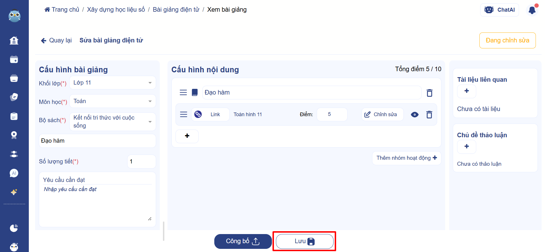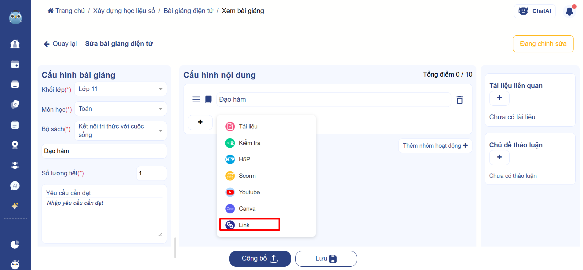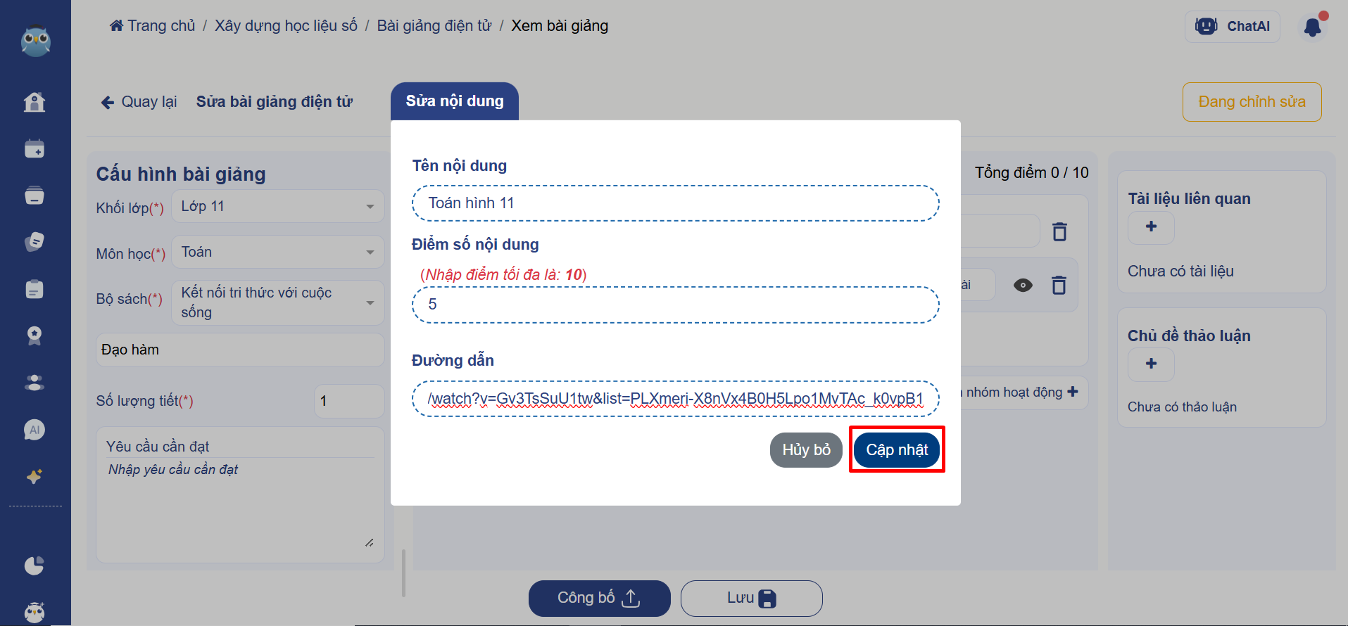Bước 7: Thầy/cô nhập tên bài giảng, nhập điểm số bài và dán link đường dẫn